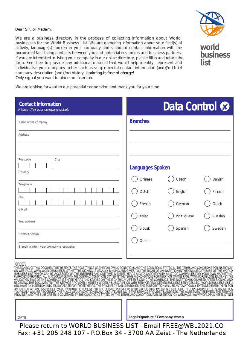 Ladies and Gentlemen, In order to have your business(es) inserted in our registry of General Companies for the 2021/2022 edition; please print and complete the attached form (wbl2021co.jpg) and send it to this address: World Business-List Postbox 34 3700 AA Zeist Nederland Fax: +31 30 310 0126 or email it to the email address printed on the form. Updating is free of charge! This form can also be used for your other domain(s) and/or business(es). A PDF version of the form is also available.